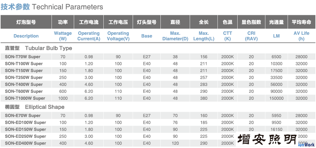 • 高光效鈉燈、70W/100W/150W/250W/400W、高光效高壓鈉燈